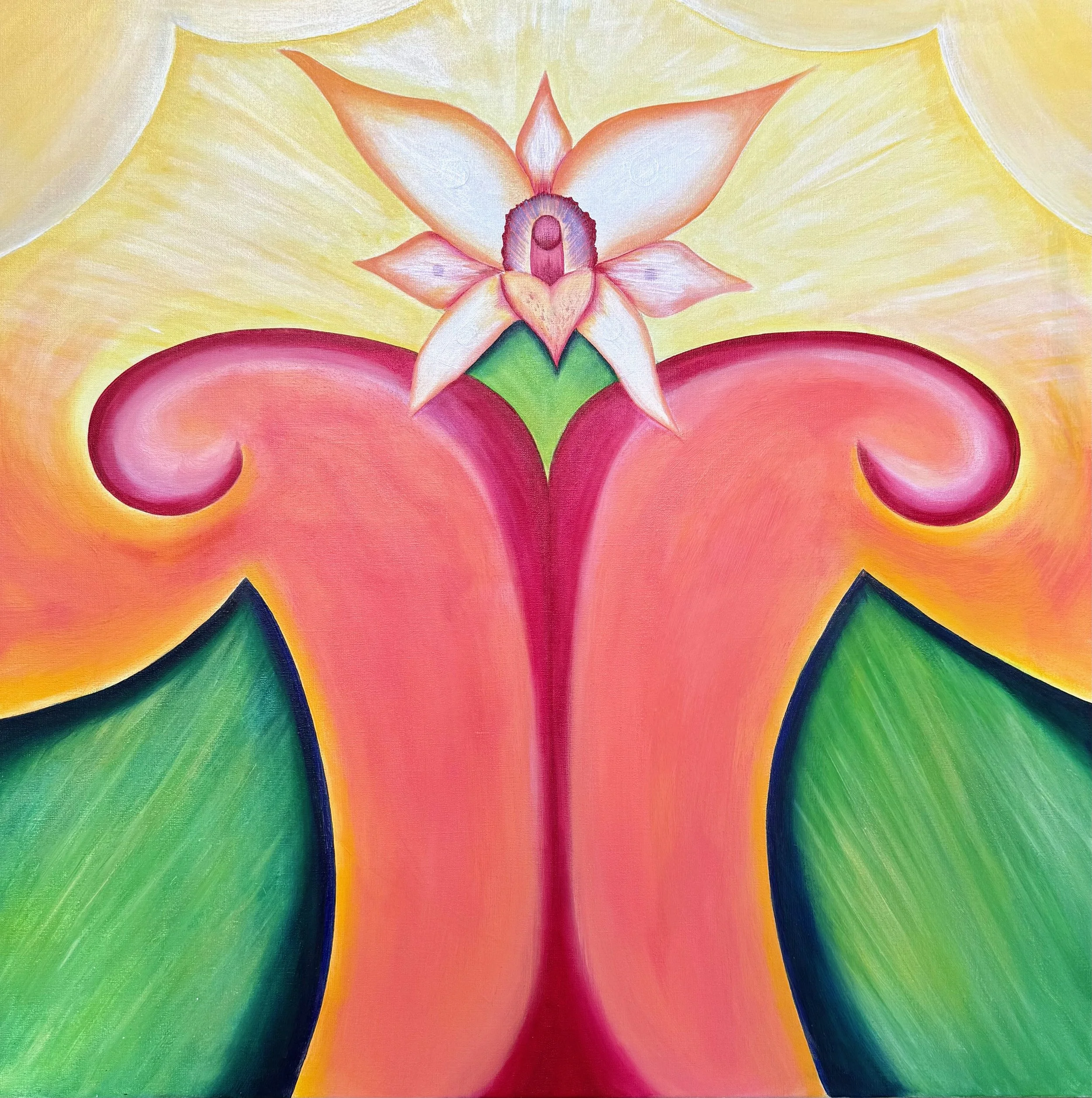 Surreal tarot inspired painting of a pink flower dripping into a golden bowl with symbols and leaves on a dark background.]()  The Hanged Man(2024) - Available upon request Size: 80x100cm